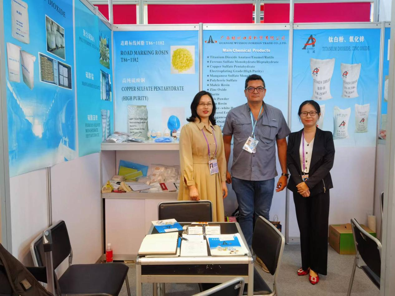 梧州口岸公司共參加三期廣交會線下展,每期參展產(chǎn)品均為公司出口業(yè)務(wù)的拳頭產(chǎn)品,包括鈦白粉(二氧化鈦)、高純度硫酸銅、氧化鋅、松香、八角及木衣架等化工品、土畜產(chǎn)品、保健品和輕工工藝品。各業(yè)務(wù)部門搶抓機(jī)遇,精心準(zhǔn)備產(chǎn)品樣板,認(rèn)真布展,并通過視頻、圖片、文字及樣品展示等方式,全方位推介參展產(chǎn)品,備受境內(nèi)外客商青睞。所在展位的客商訪問量和初步意向簽約量均頻頻告捷。參展首日,展位訪問量平均每小時(shí)70余人次,有初步采購意向的占比達(dá)10%。